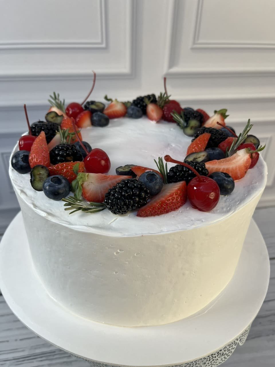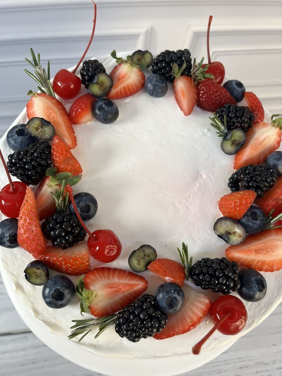 Biscocho de red Velvet, relleno y cubierto con betún de queso, decorado con frutos rojos.